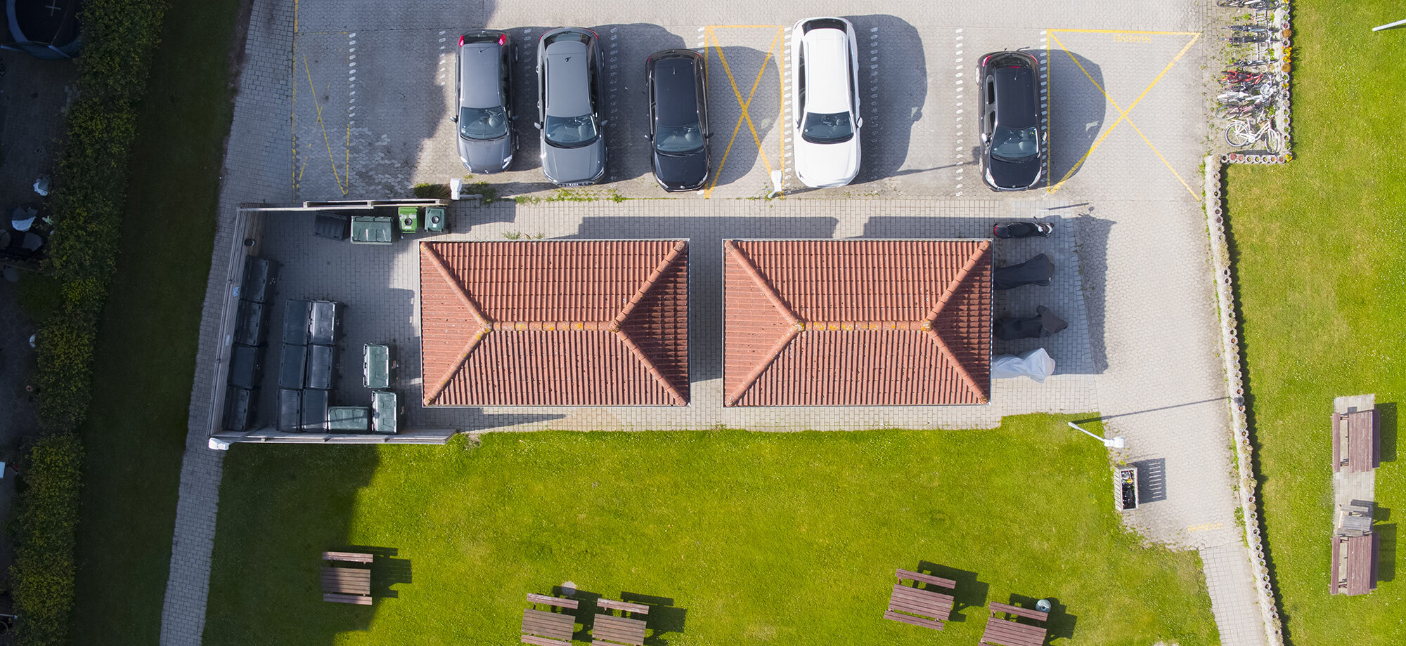 Vi har et fælles affaldscenter i midten af byggeriet, hvor affald sorteret efter Køge Kommunes anvisninger placeres i de forskellige typer af sorteringsbeholdere og containere.